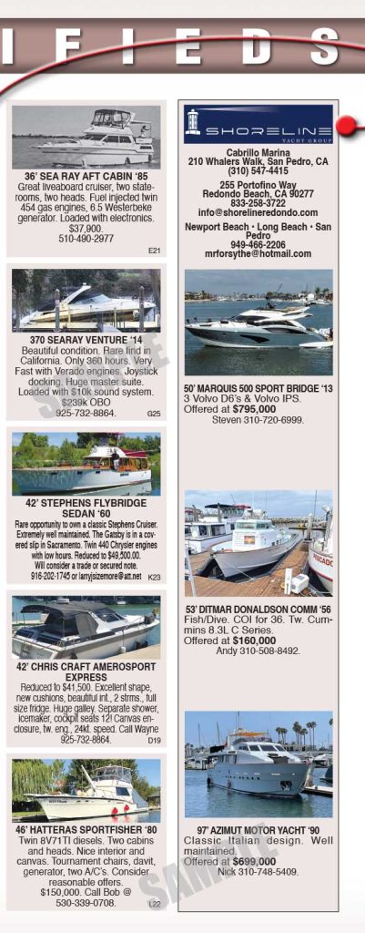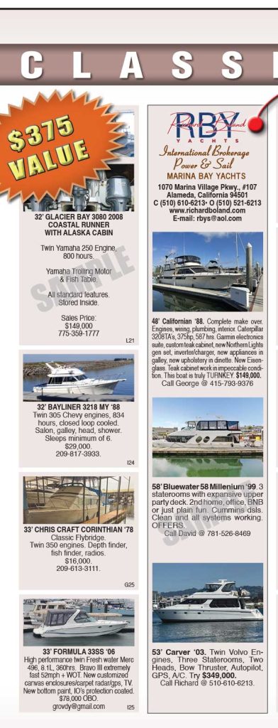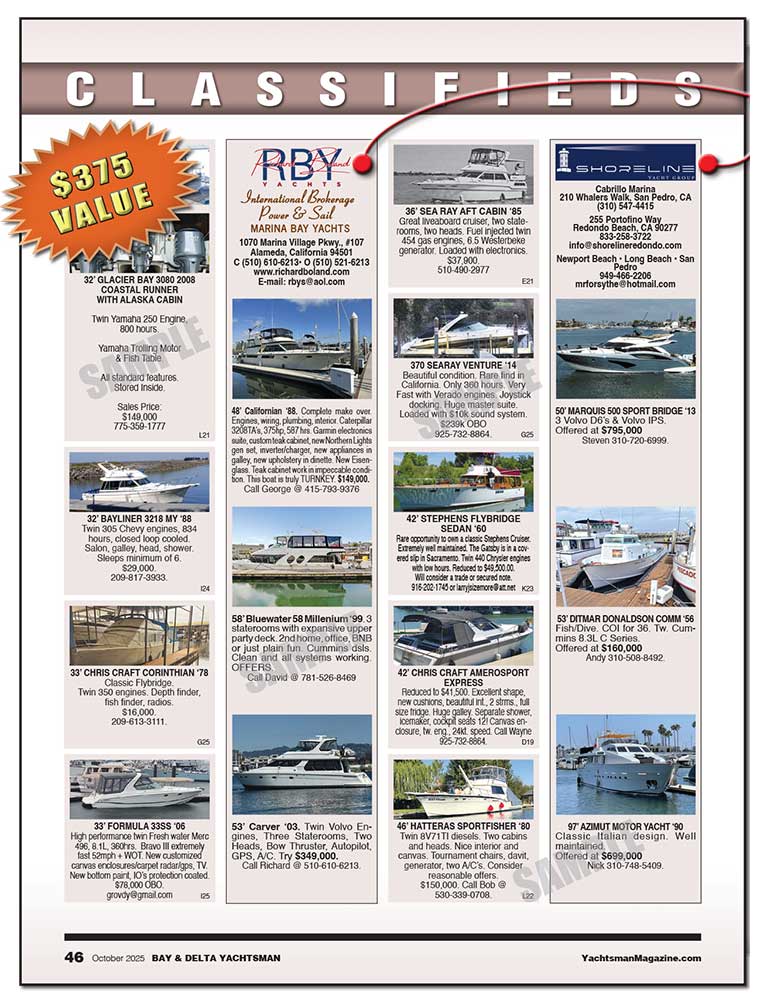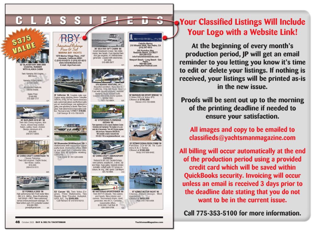 All images and copy to be emailed to classifieds@yachtsmanmagazine.com